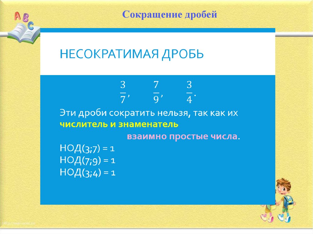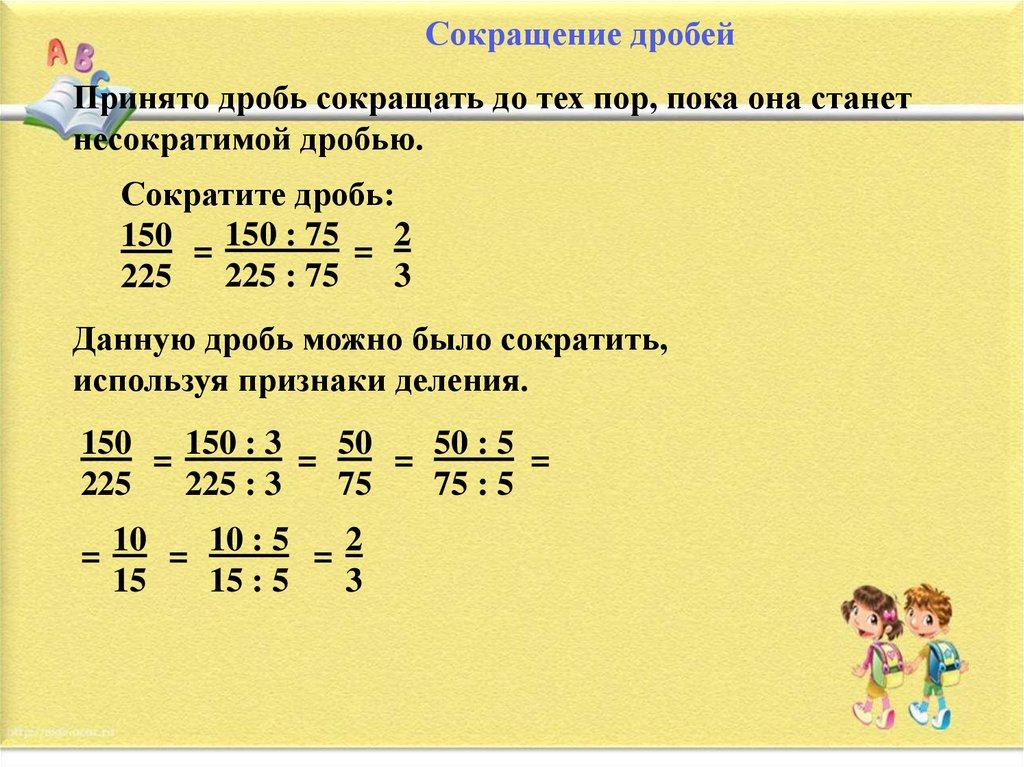Сокращение дробейПринято дробь сокращать до тех пор, пока она станет