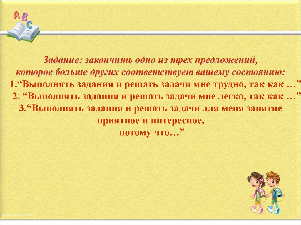 Задание: закончить одно из трех предложений,которое больше других соответствует вашему состоянию: