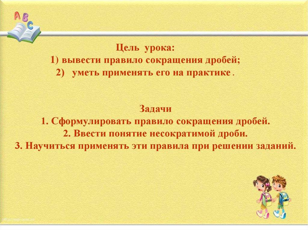 Цель урока:1) вывести правило сокращения дробей;