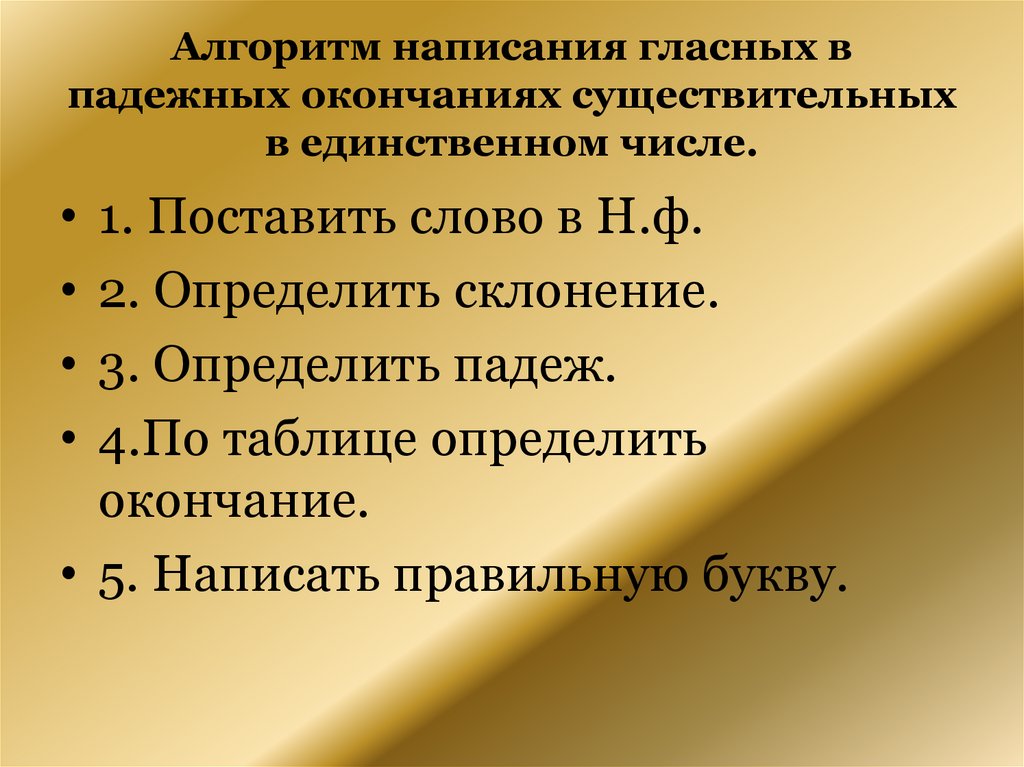 Алгоритм написания гласных впадежных окончаниях существительных