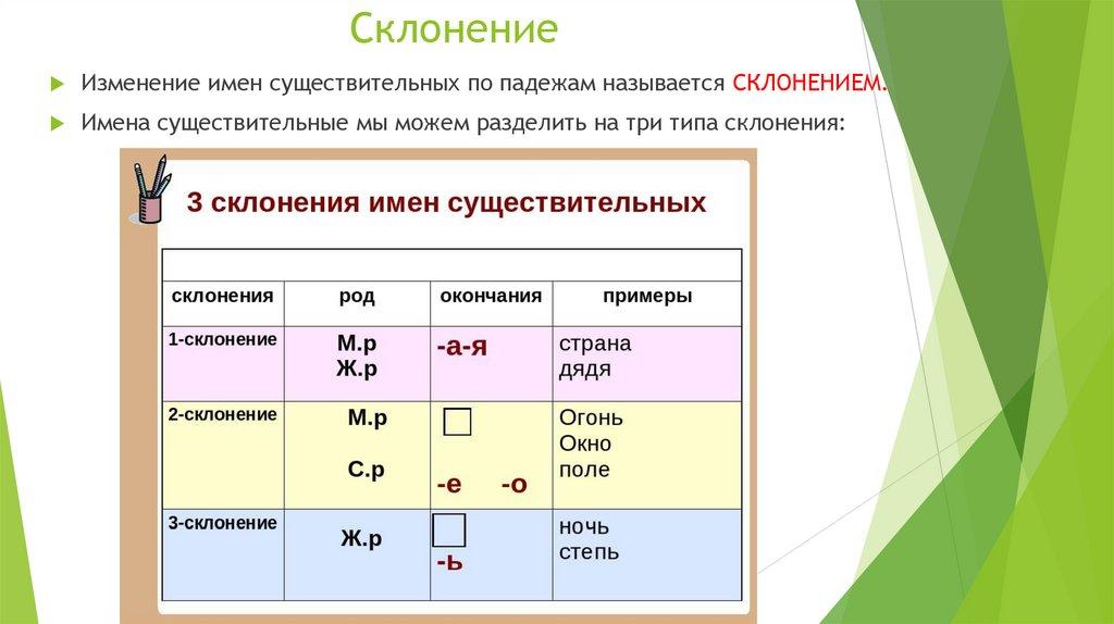 СклонениеИзменение имен существительных по падежам называется СКЛОНЕНИЕМ.
