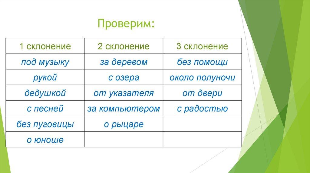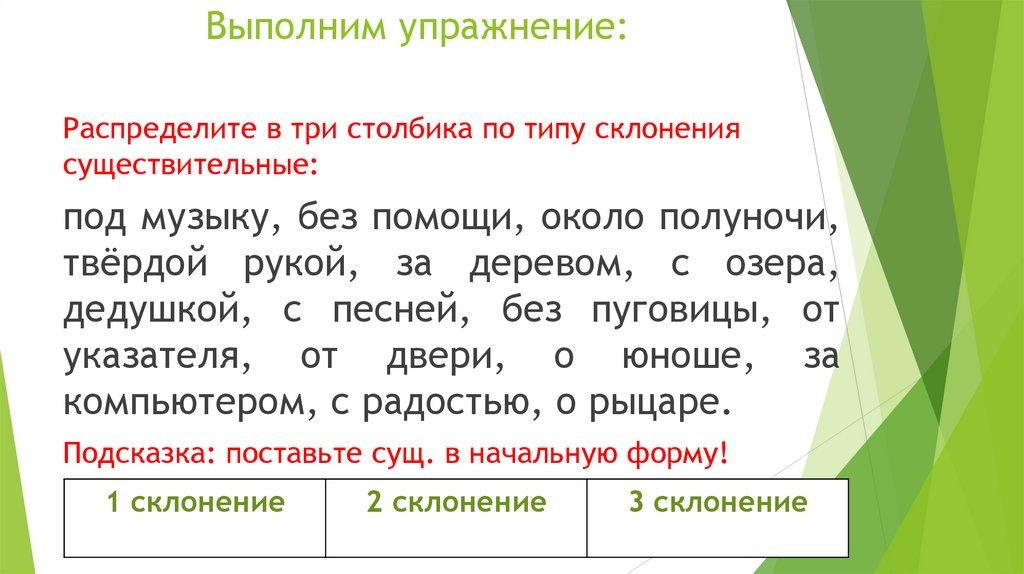 Выполним упражнение:Распределите в три столбика по типу склонения