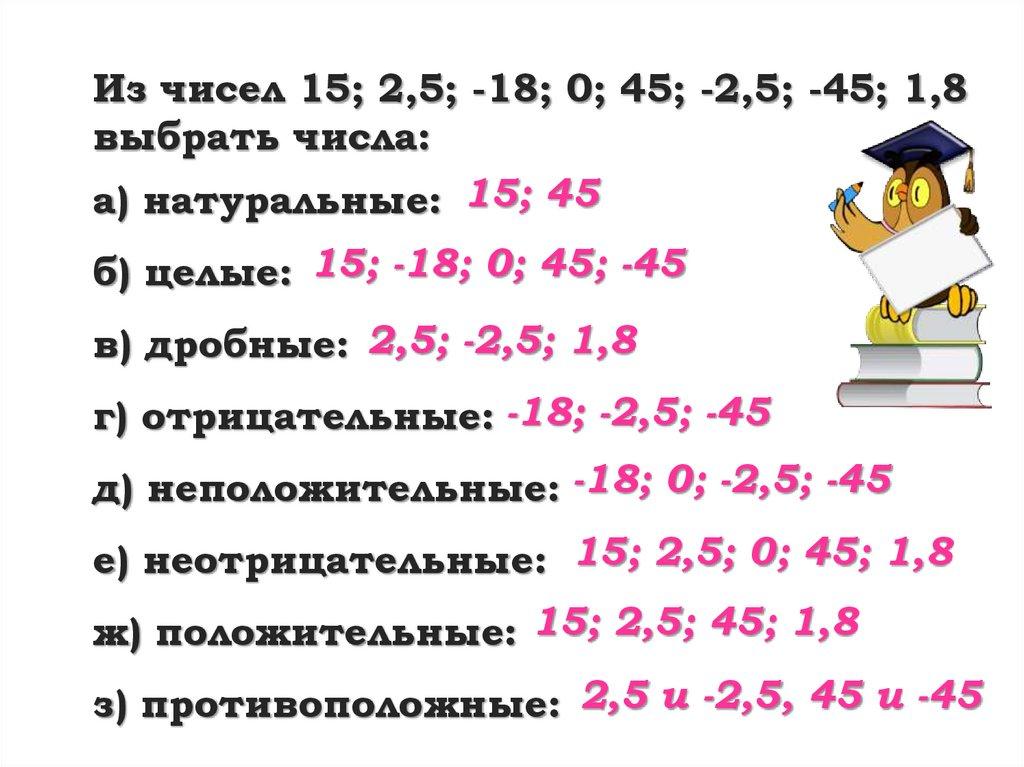 Из чисел 15; 2,5; -18; 0; 45; -2,5; -45; 1,8выбрать числа: