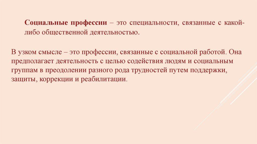 Социальные профессии – это специальности, связанные с какойлибо общественной деятельностью.В узком смысле – это профессии, связанные с социальной работой. Она