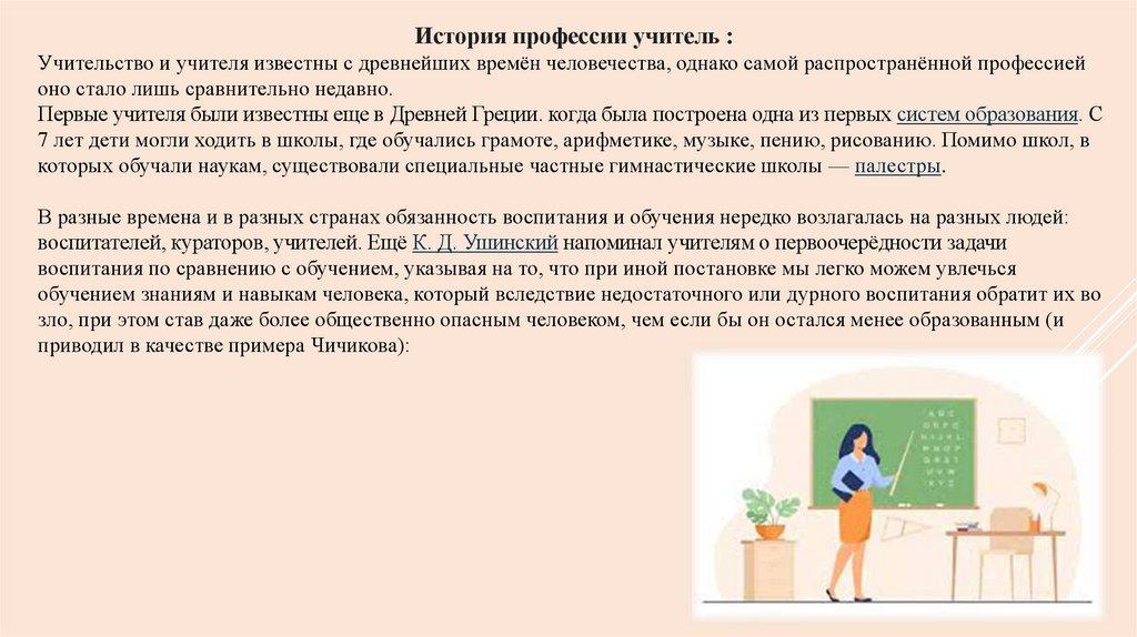 История профессии учитель :Учительство и учителя известны с древнейших времён человечества, однако самой распространённой профессией