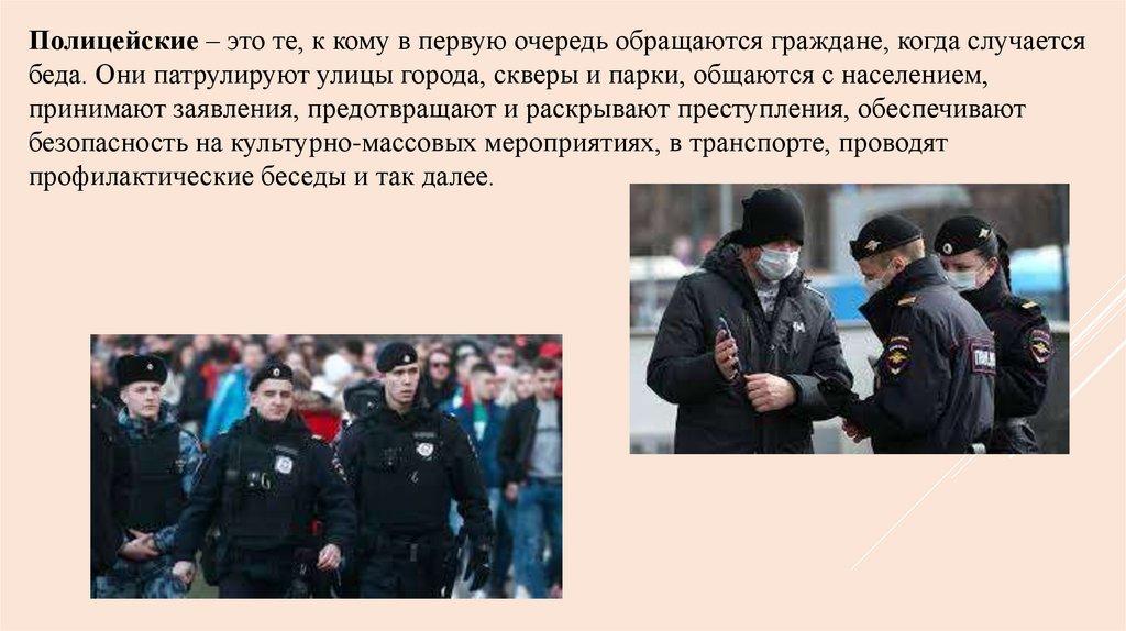 Полицейские – это те, к кому в первую очередь обращаются граждане, когда случаетсябеда. Они патрулируют улицы города, скверы и парки, общаются с населением,