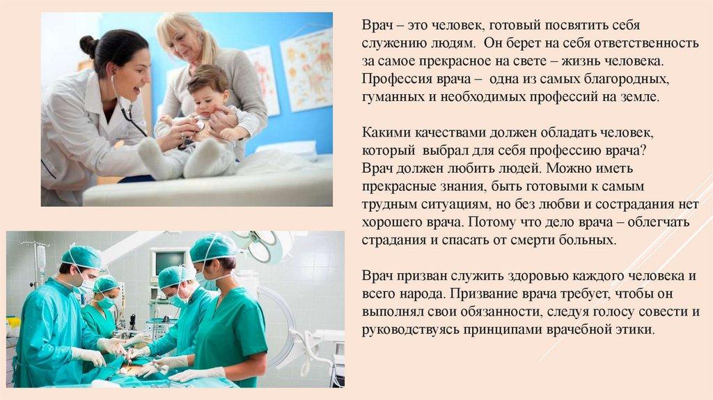 Врач – это человек, готовый посвятить себяслужению людям. Он берет на себя ответственность
