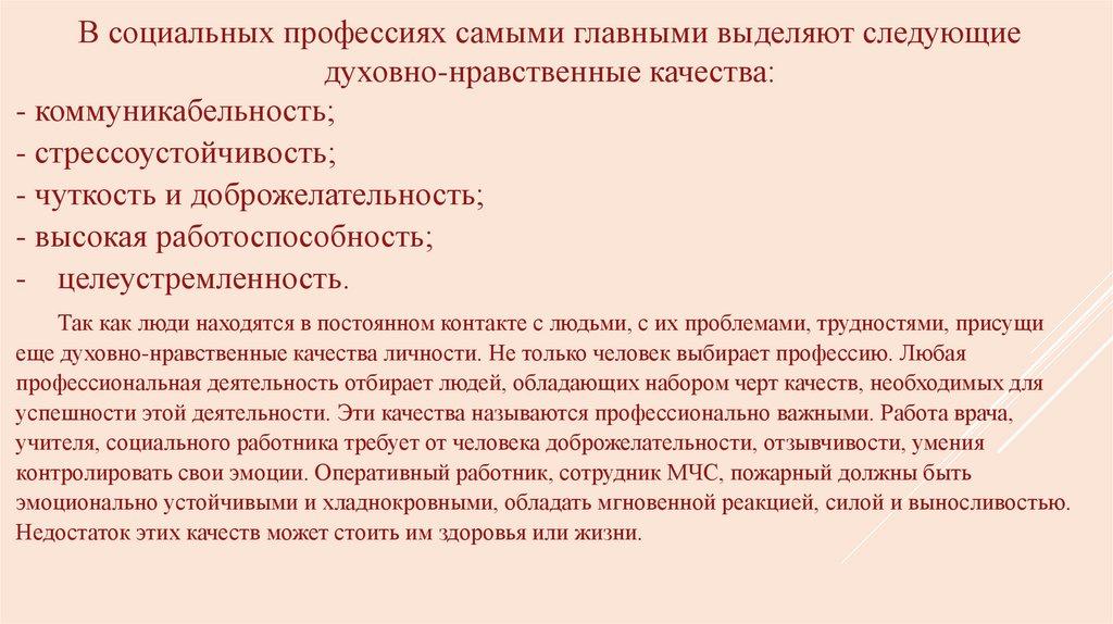 В социальных профессиях самыми главными выделяют следующиедуховно-нравственные качества: