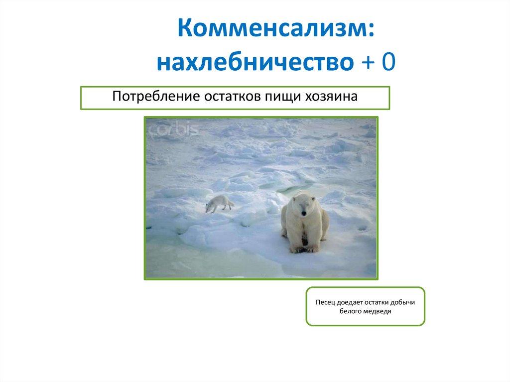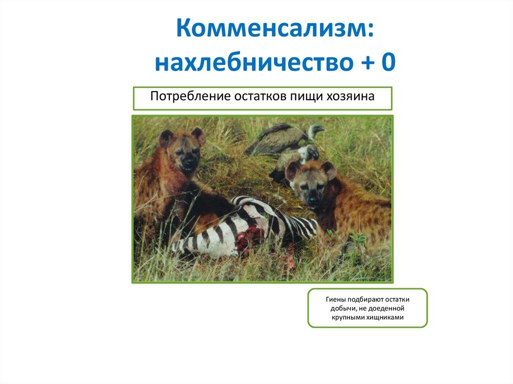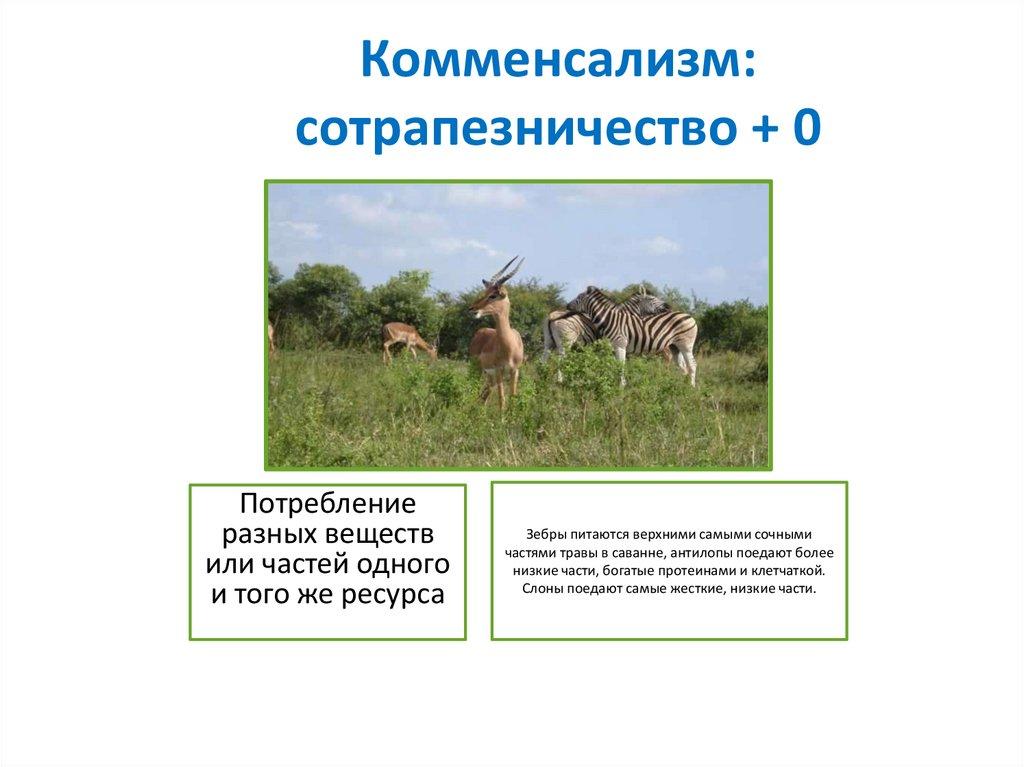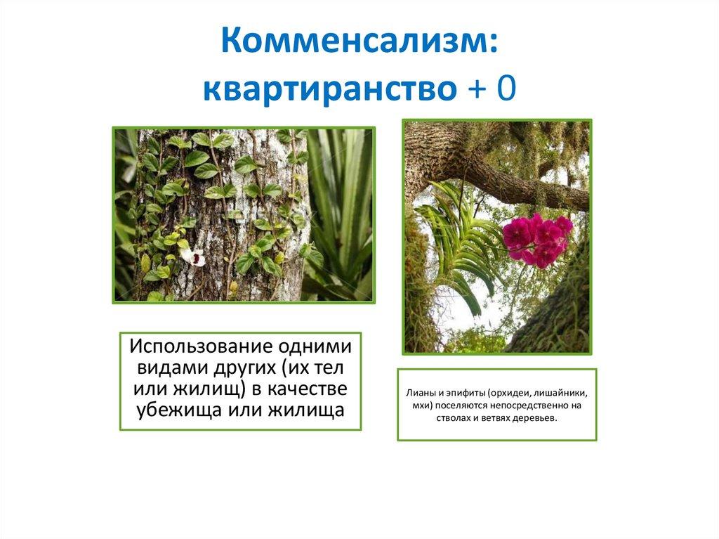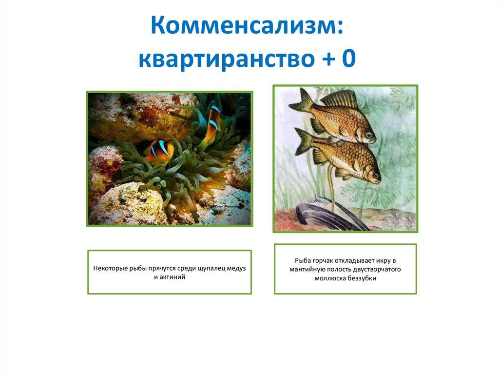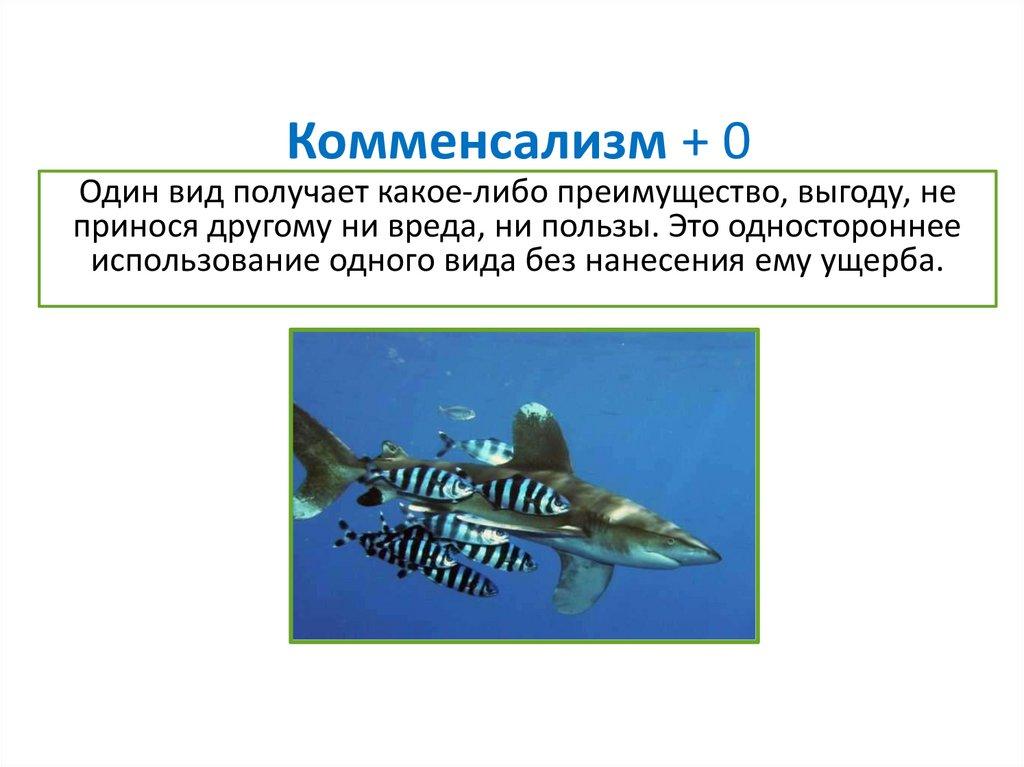 Комменсализм + 0Один вид получает какое-либо преимущество, выгоду, не