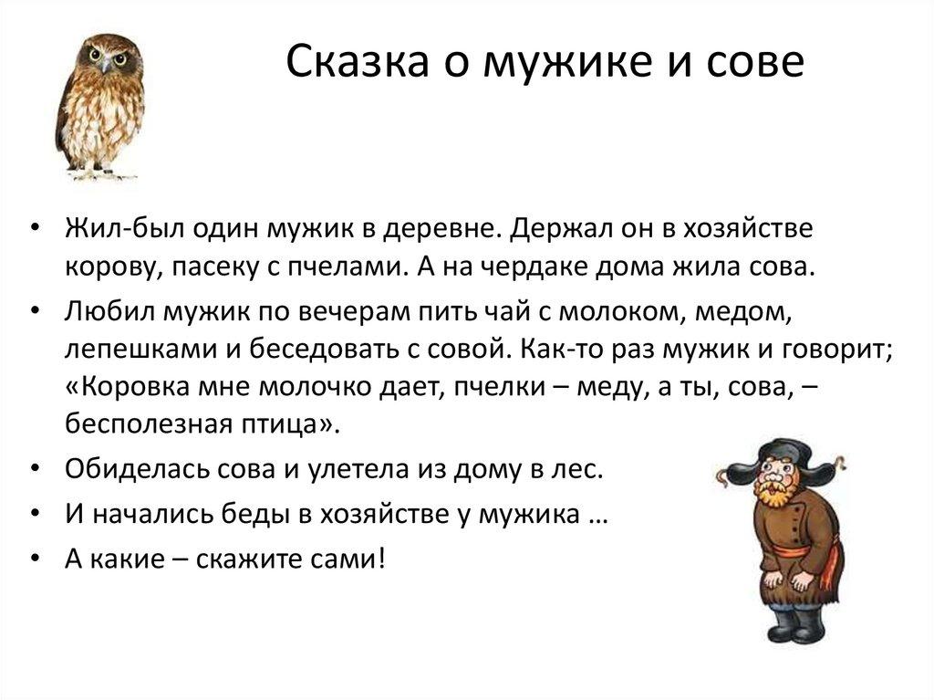 Сказка о мужике и сове• Жил-был один мужик в деревне. Держал он в хозяйстве
