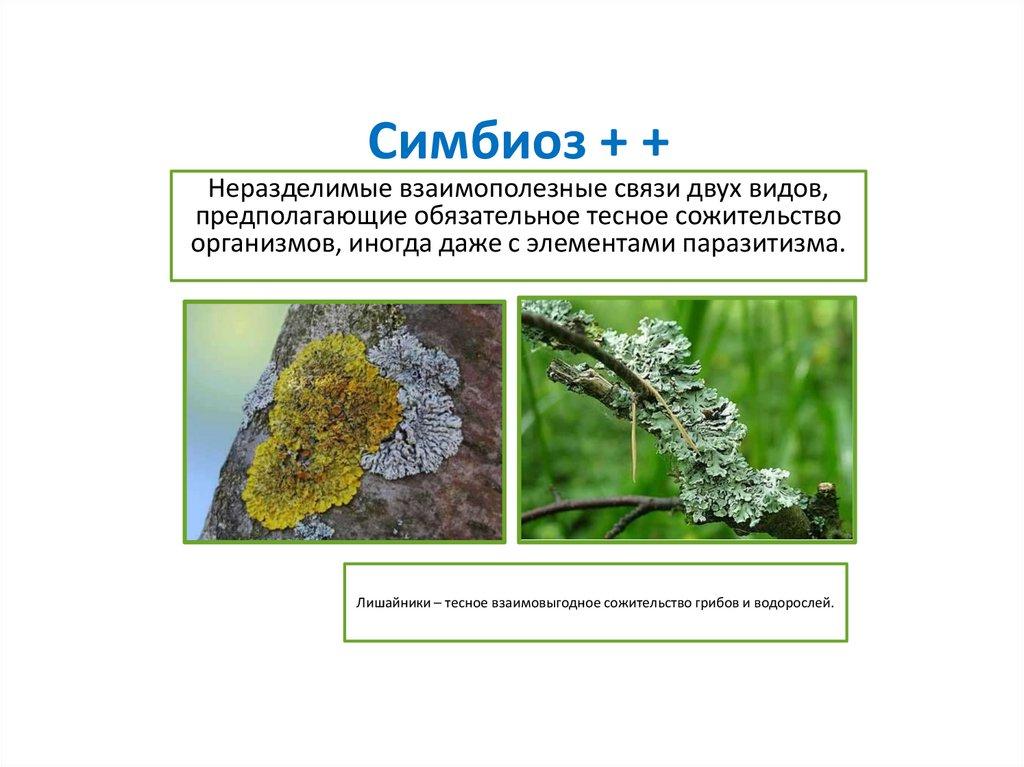 Лишайники – тесное взаимовыгодное сожительство грибов и водорослей.