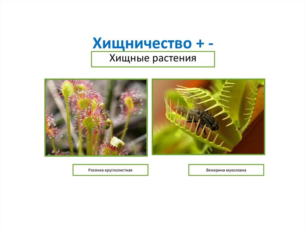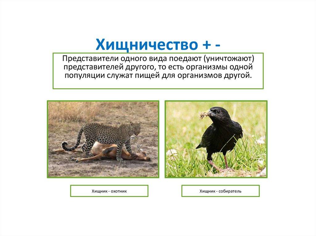 Хищничество + Представители одного вида поедают (уничтожают)представителей другого, то есть организмы одной