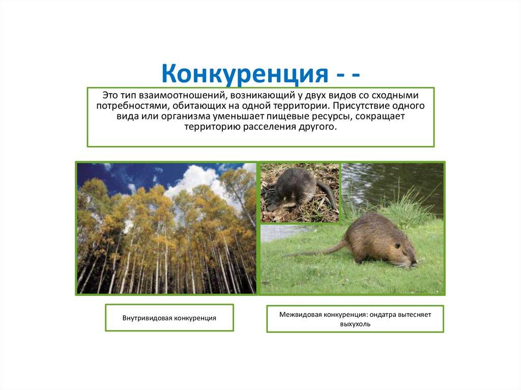Конкуренция - Это тип взаимоотношений, возникающий у двух видов со сходнымипотребностями, обитающих на одной территории. Присутствие одного