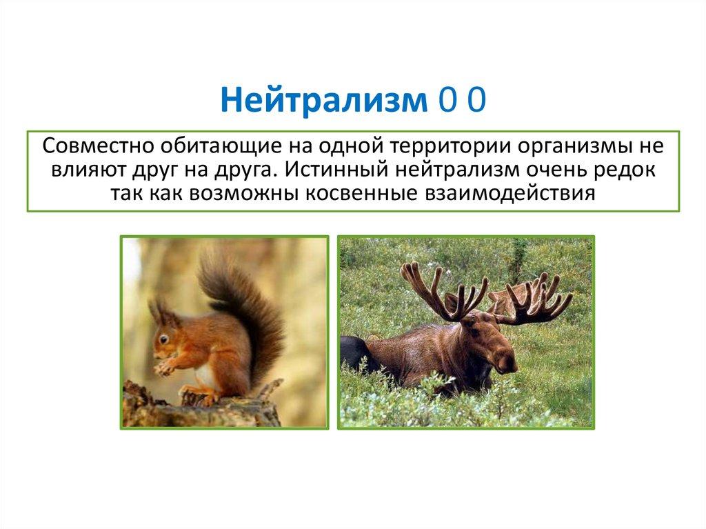 Нейтрализм 0 0Совместно обитающие на одной территории организмы не