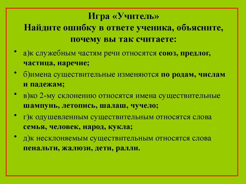 Игра «Учитель»Найдите ошибку в ответе ученика, объясните,