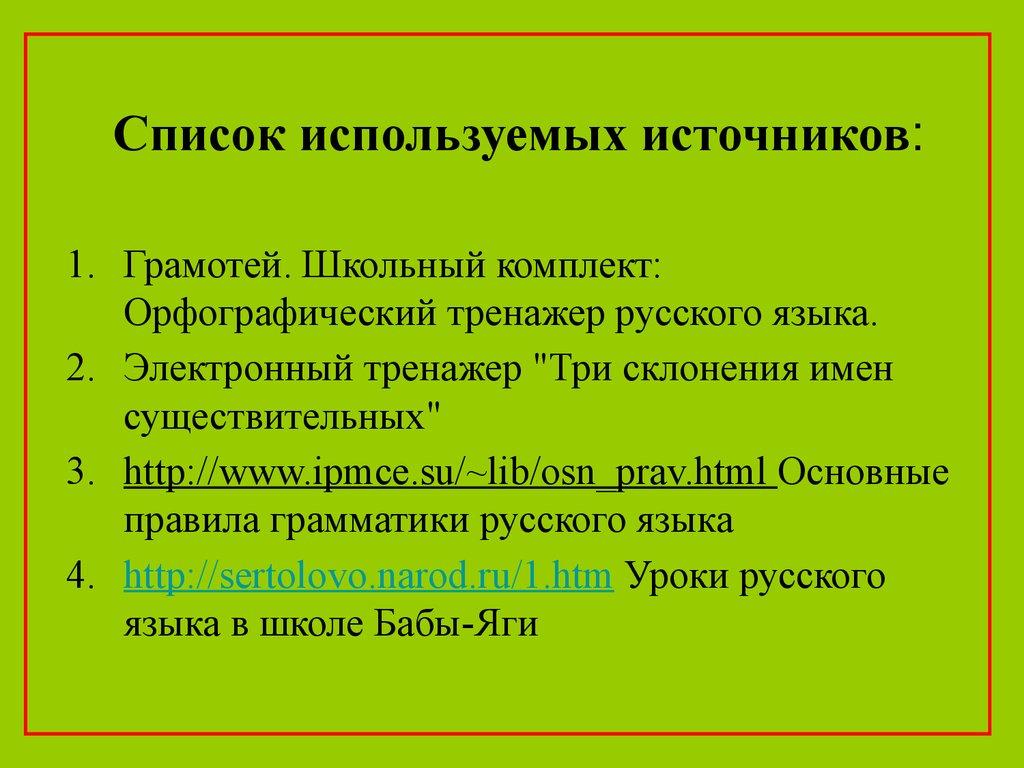 Список используемых источников:1. Грамотей. Школьный комплект: