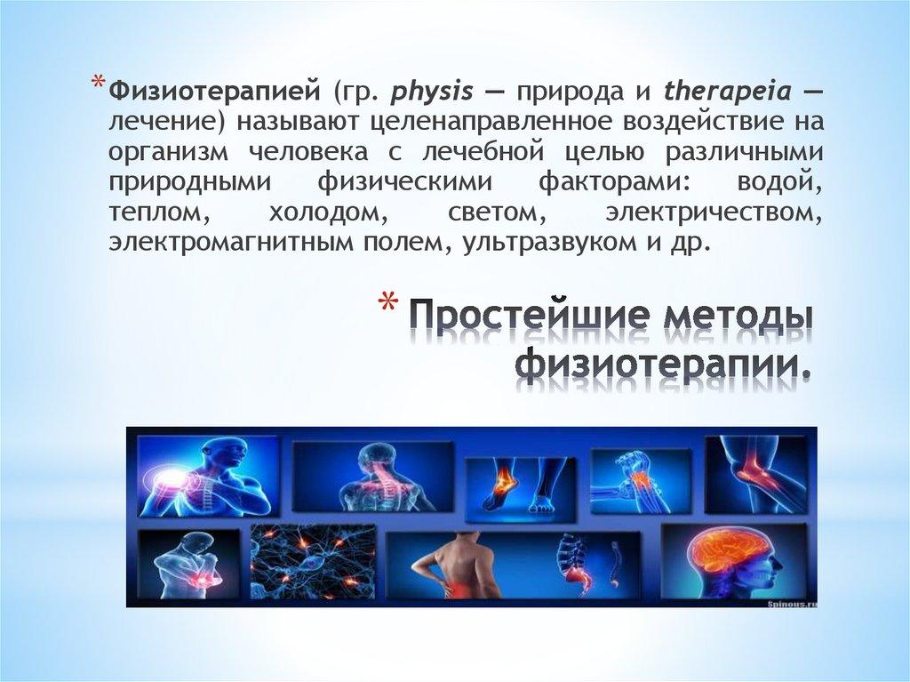 * Физиотерапией (гр. physis — природа и therapeia —лечение) называют целенаправленное воздействие на