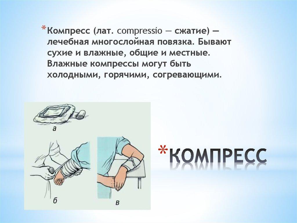 * Компресс (лат. compressio — сжатие) —лечебная многослойная повязка. Бывают