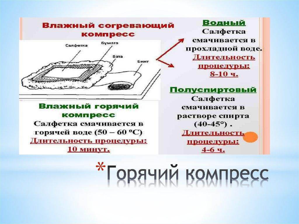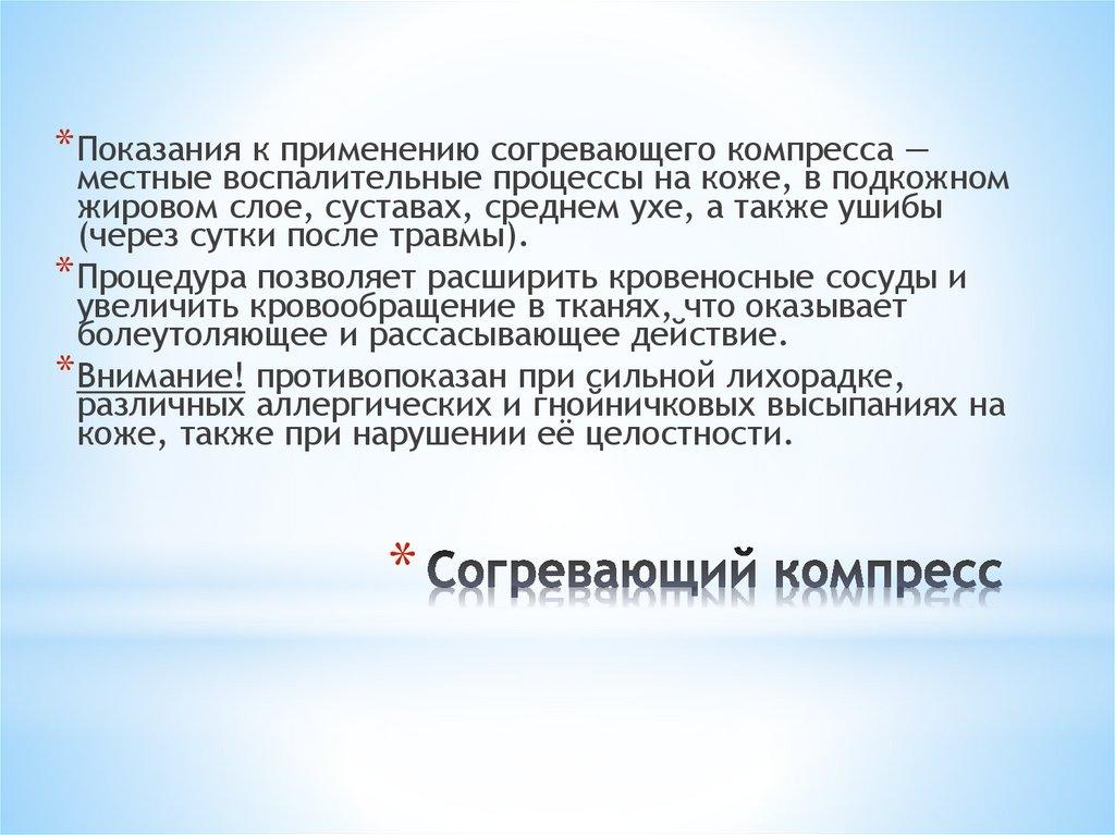 * Показания к применению согревающего компресса —местные воспалительные процессы на коже, в подкожном