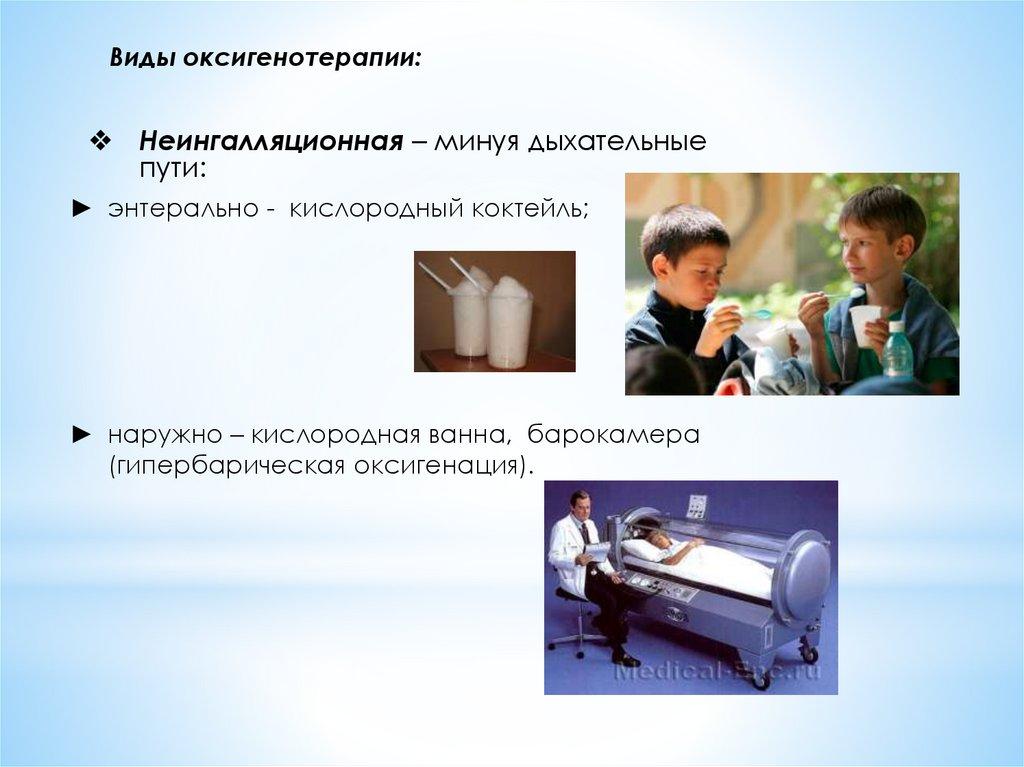Виды оксигенотерапии:❖ Неингалляционная – минуя дыхательные