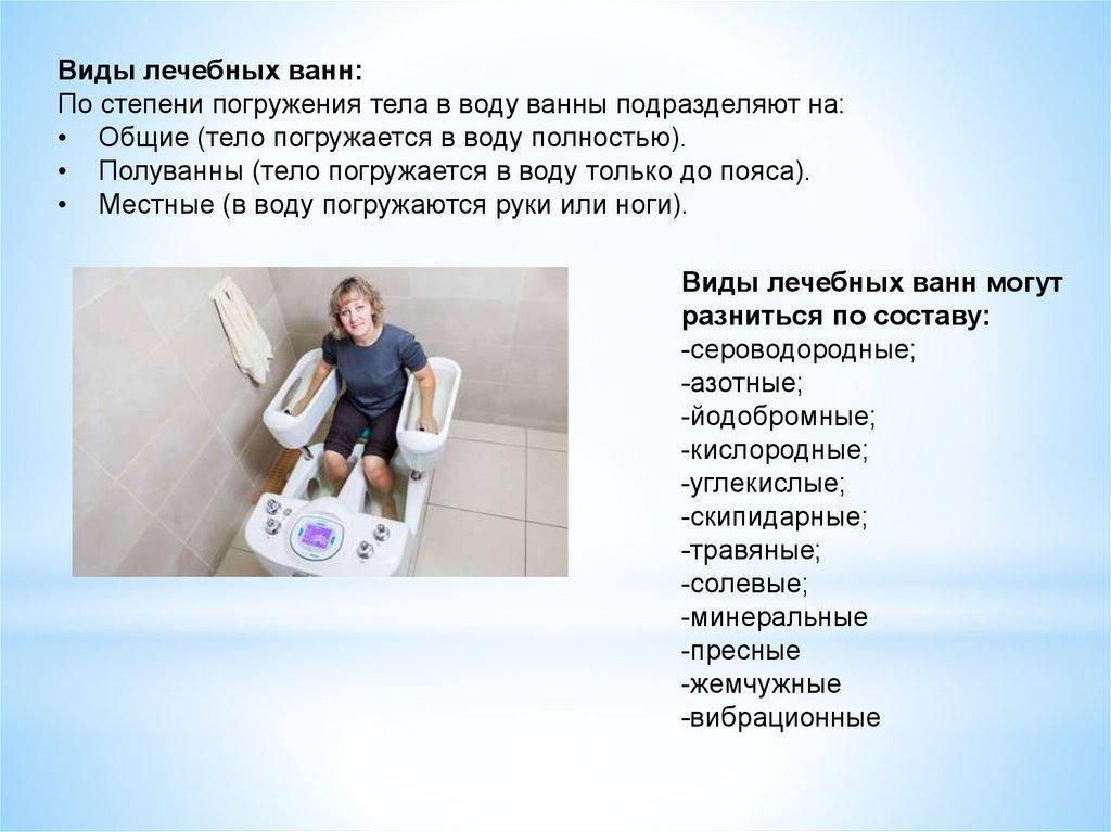 Виды лечебных ванн:По степени погружения тела в воду ванны подразделяют на: