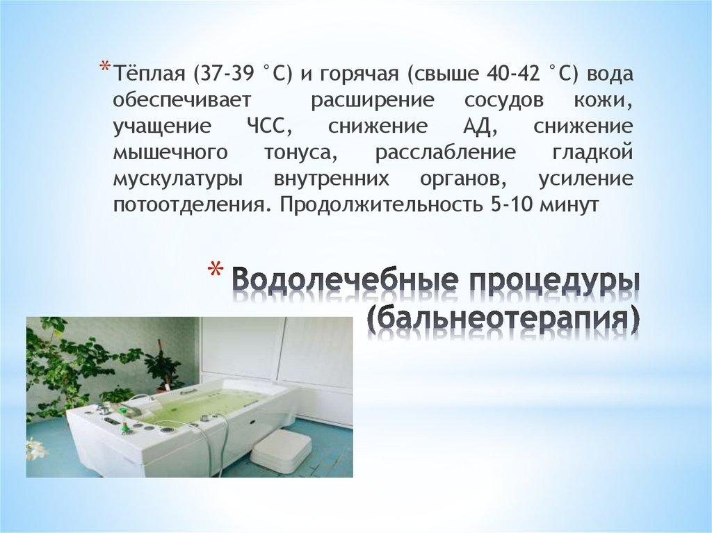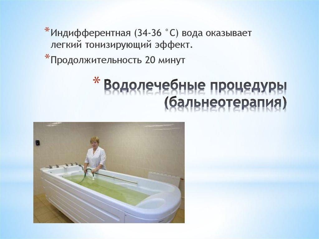 * Индифферентная (34-36 °С) вода оказываетлегкий тонизирующий эффект.
