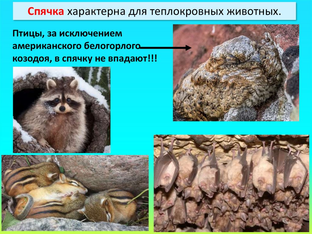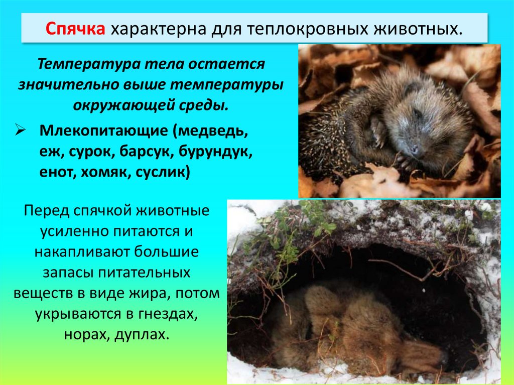 Спячка характерна для теплокровных животных.Температура тела остается