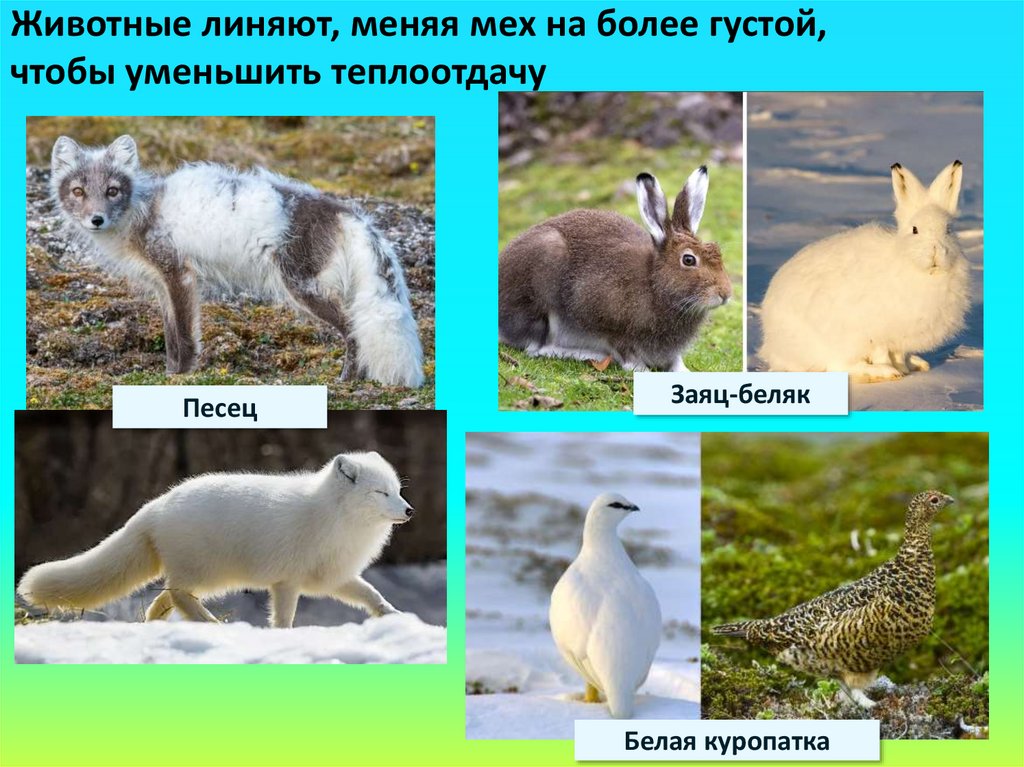 Животные линяют, меняя мех на более густой,чтобы уменьшить теплоотдачу