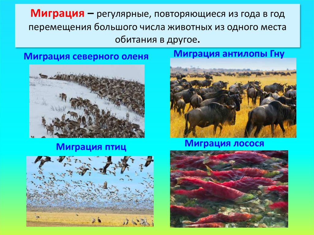 Миграция – регулярные, повторяющиеся из года в годперемещения большого числа животных из одного места