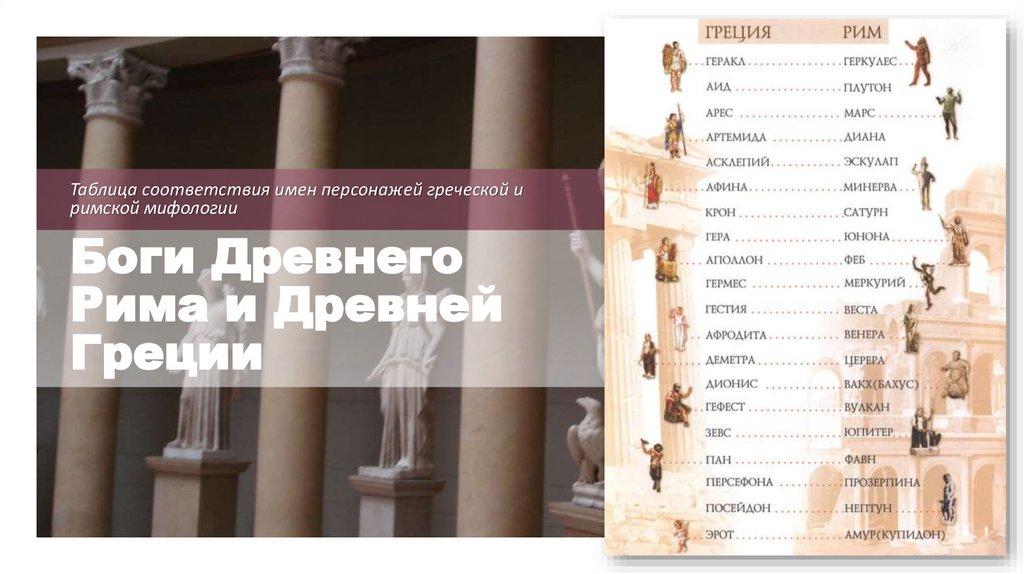 Таблица соответствия имен персонажей греческой иримской мифологии