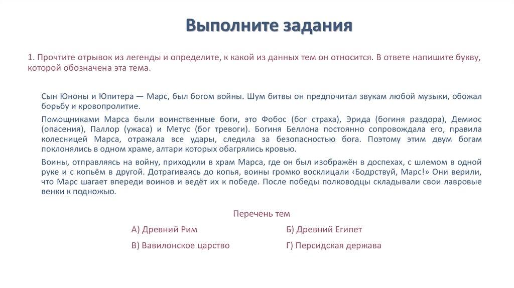 Выполните задания1. Прочтите отрывок из легенды и определите, к какой из данных тем он относится. В ответе напишите букву,