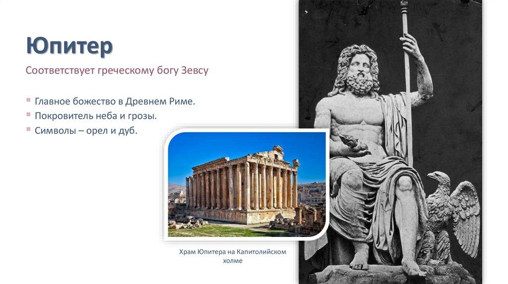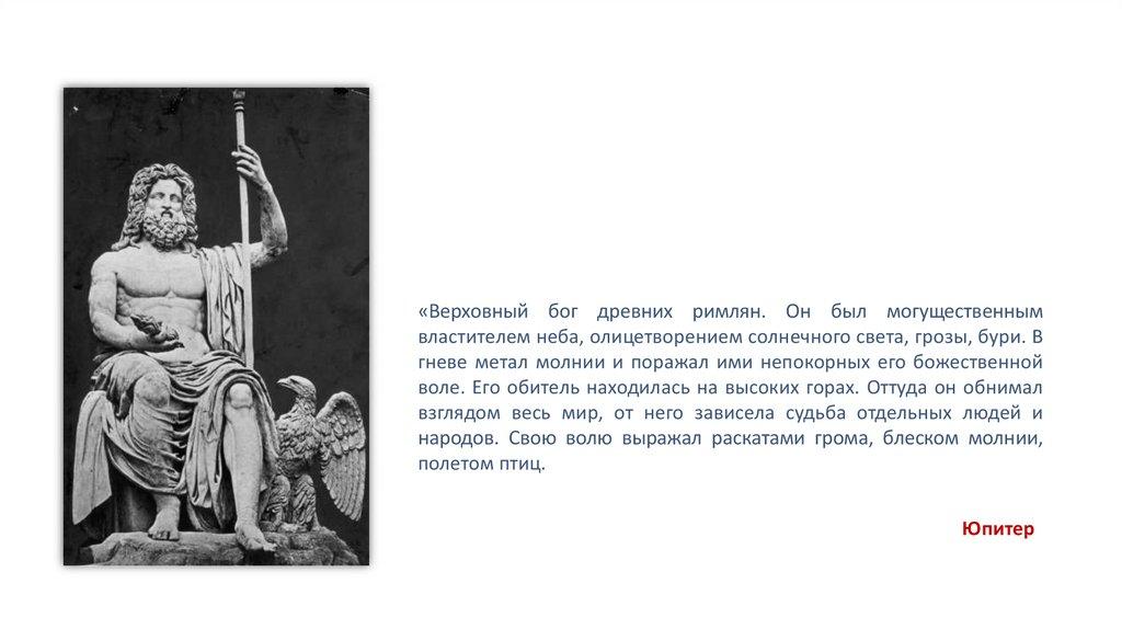 «Верховный бог древних римлян. Он был могущественнымвластителем неба, олицетворением солнечного света, грозы, бури. В