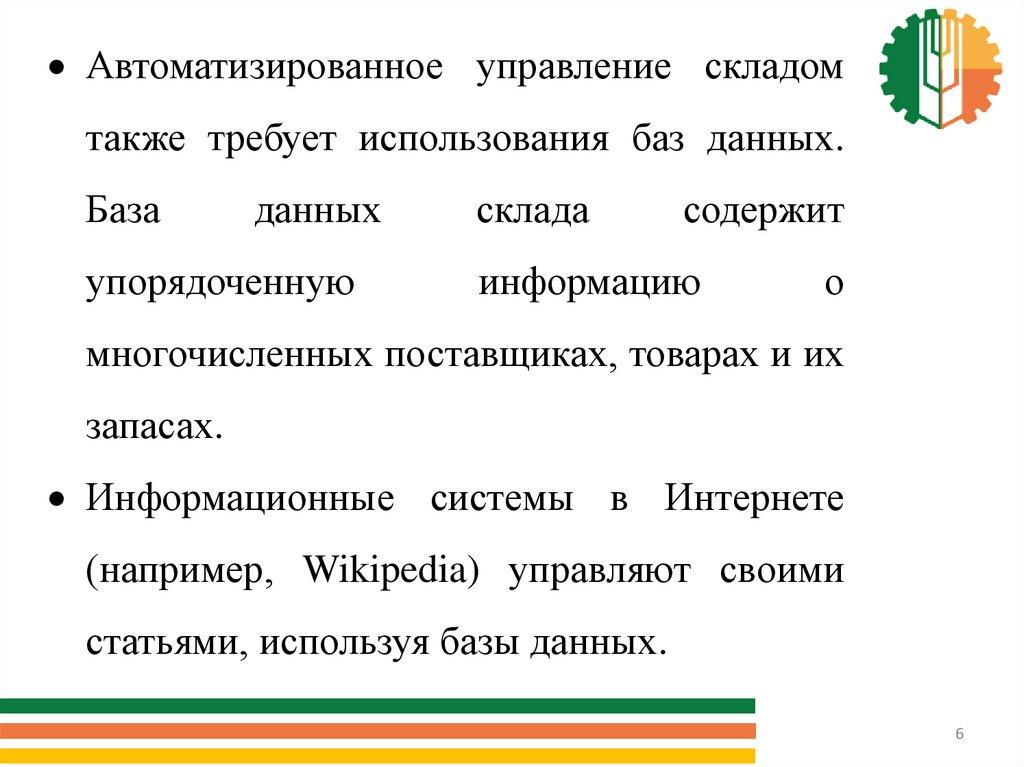 Автоматизированное управление складомтакже требует использования баз данных.