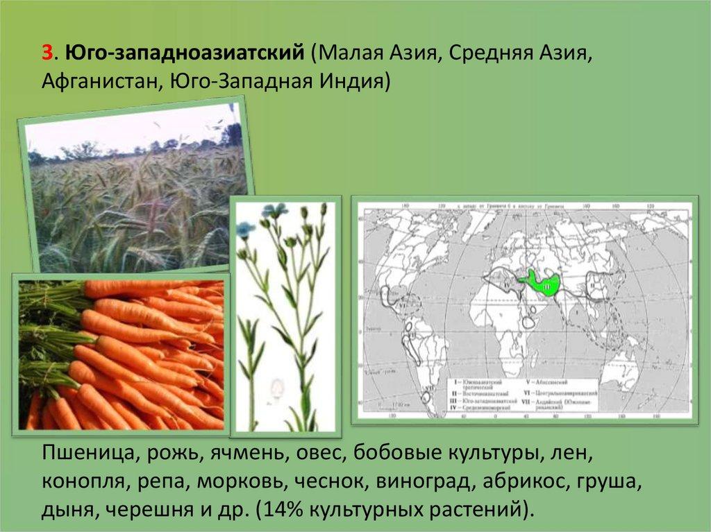 16. 3. Юго-западноазиатский (Малая Азия, Средняя Азия, Афганистан, Юго-Западная Индия) Пшеница, рожь, ячмень, овес, бобовые