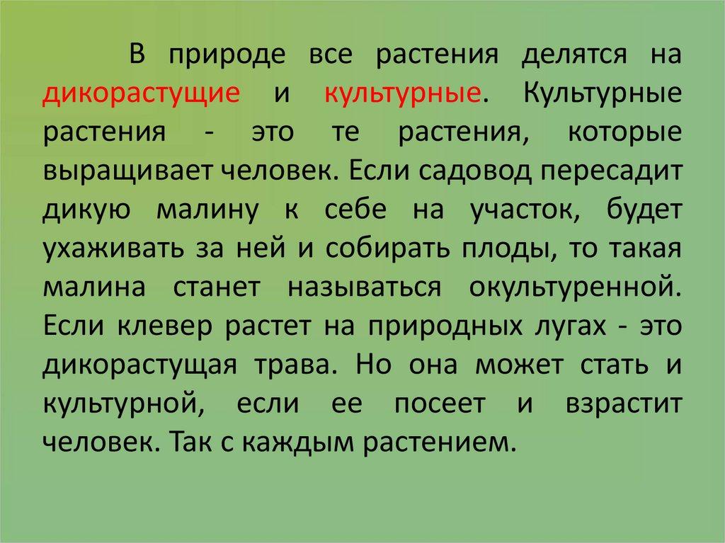В природе все растения делятся надикорастущие и культурные. Культурные