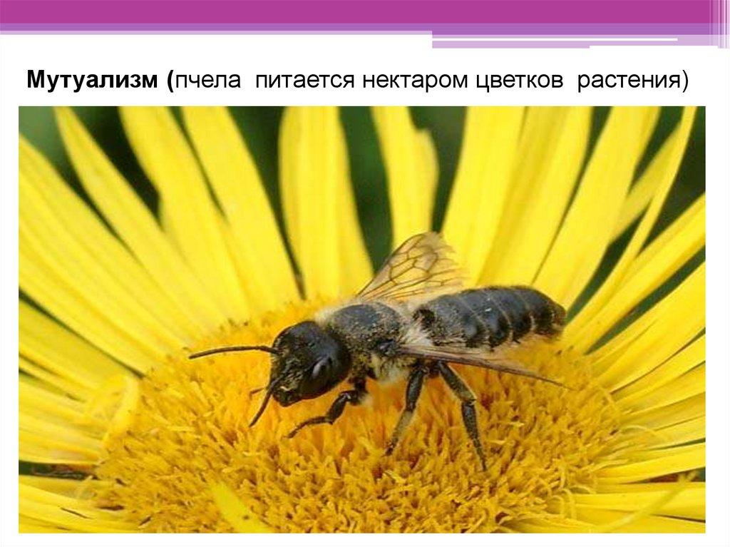 Мутуализм (пчела питается нектаром цветков растения)17.