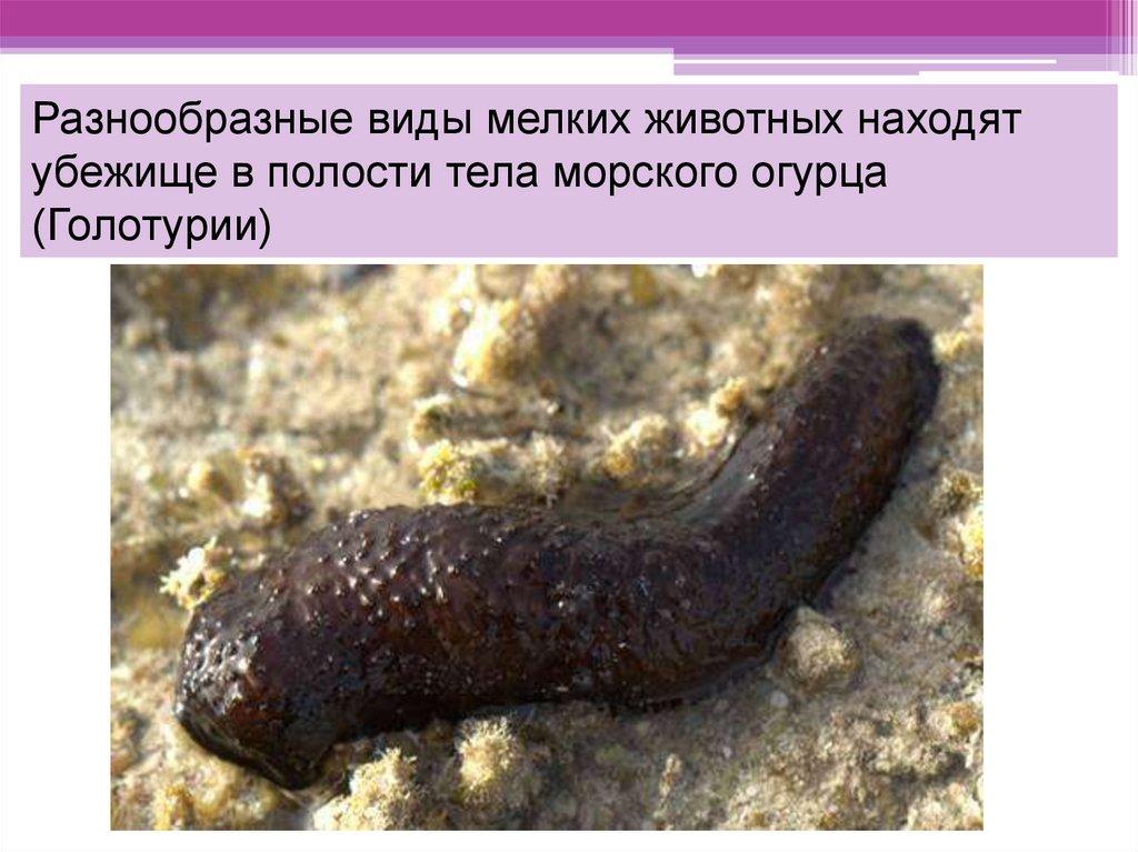Разнообразные виды мелких животных находятубежище в полости тела морского огурца