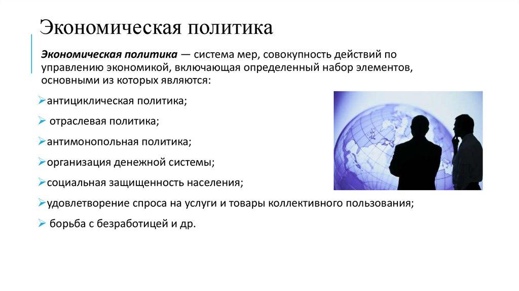 Экономическая политикаЭкономическая политика — система мер, совокупность действий по