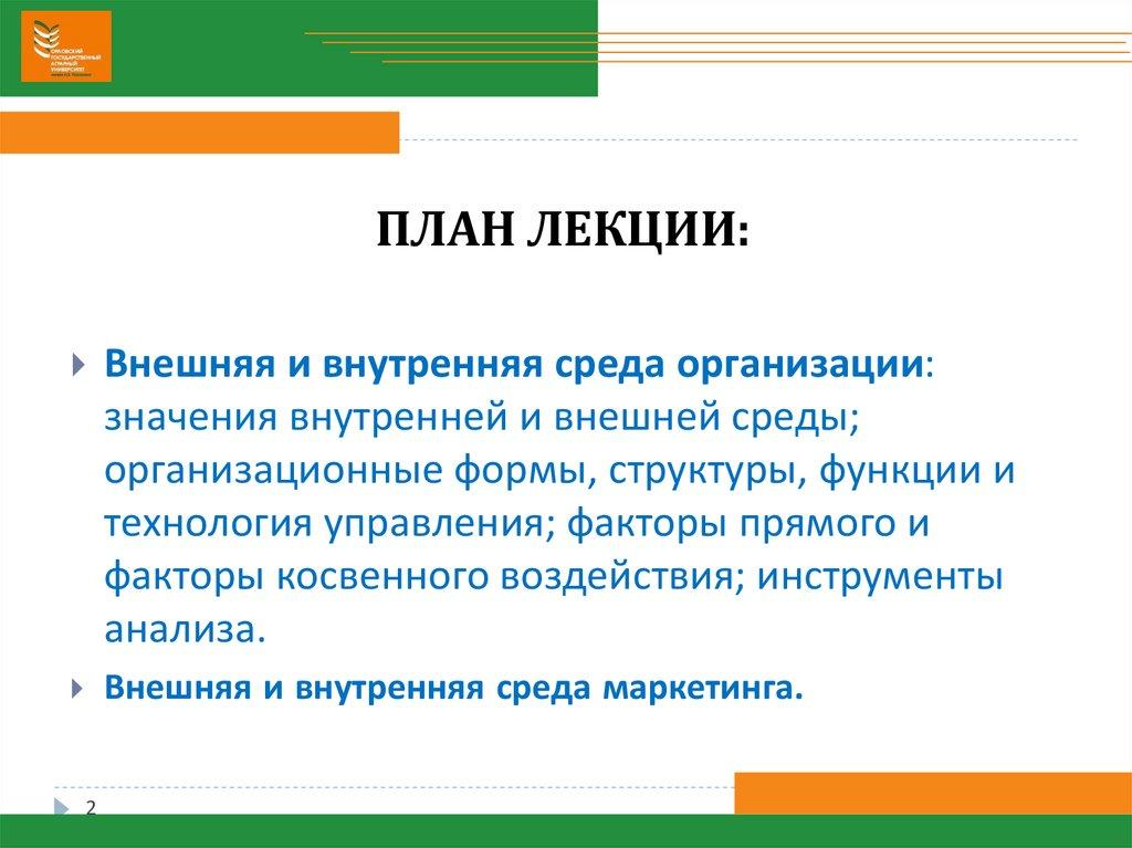 ПЛАН ЛЕКЦИИ:Внешняя и внутренняя среда организации: