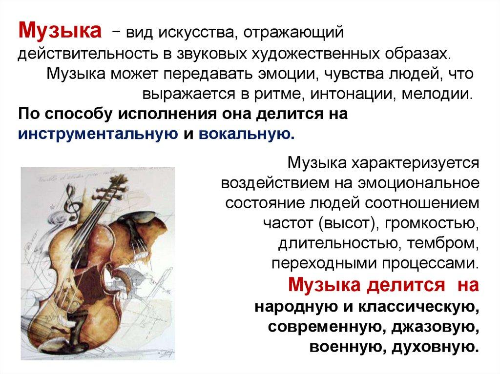Музыка − вид искусства, отражающийдействительность в звуковых художественных образах.