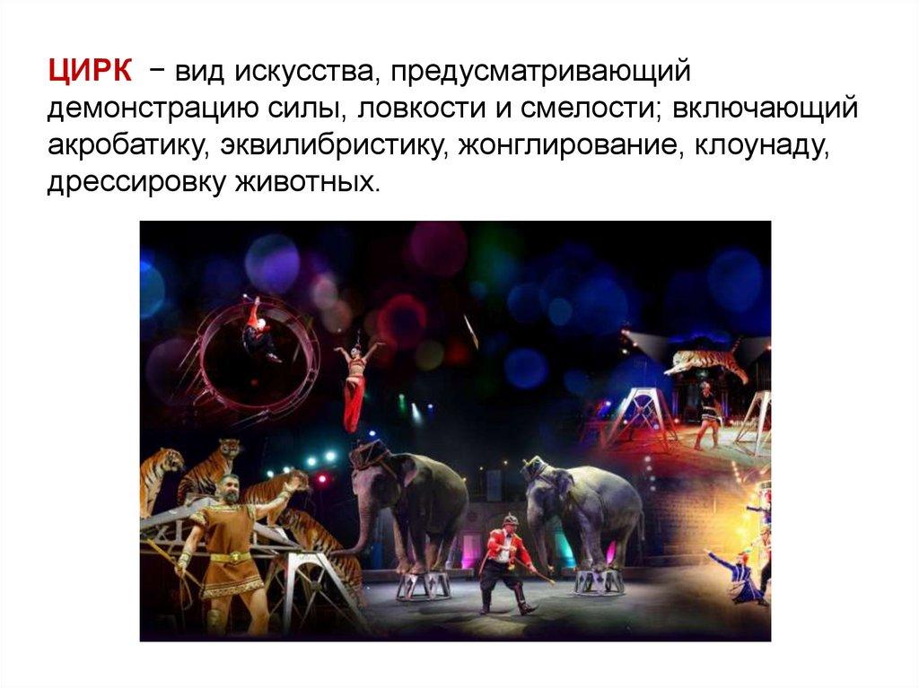 ЦИРК − вид искусства, предусматривающийдемонстрацию силы, ловкости и смелости; включающий