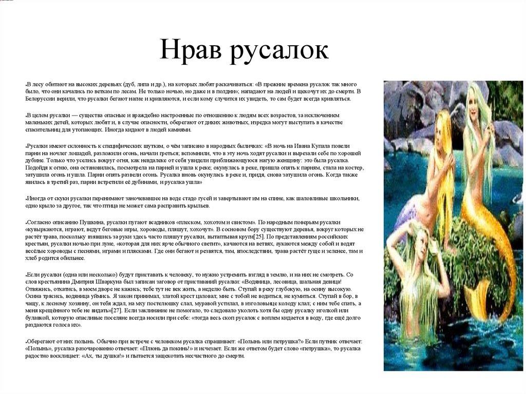 В целом русалки — существа опасные и враждебно настроенные по отношению к людям всех возрастов, за исключением