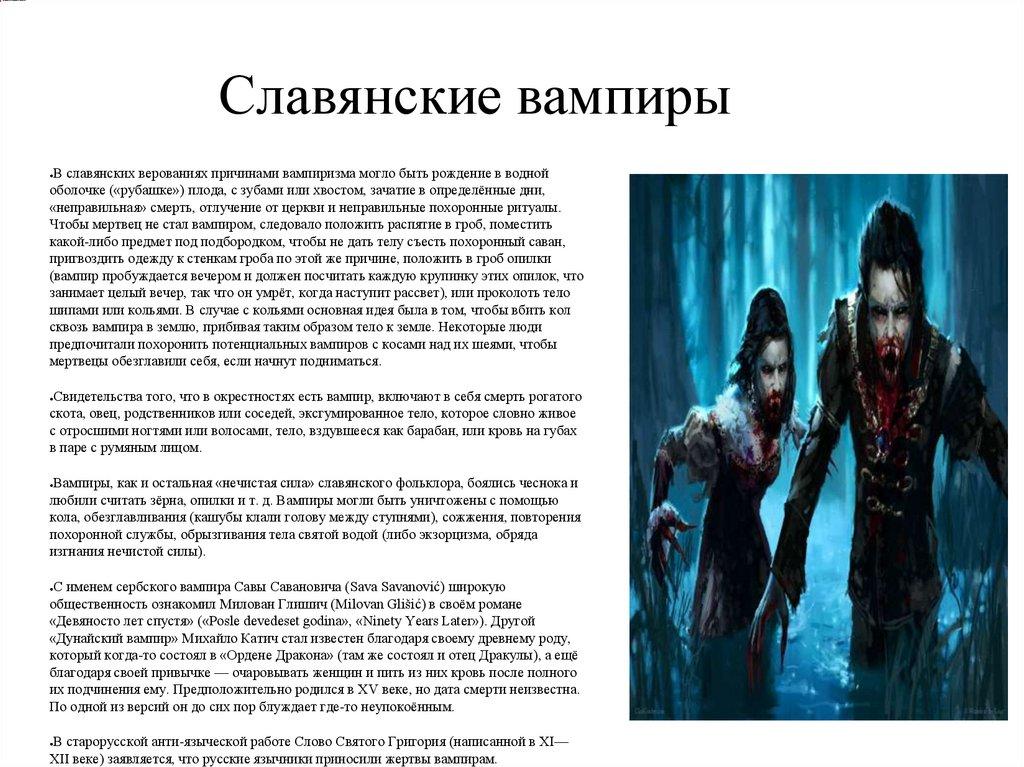 Славянские вампирыВ славянских верованиях причинами вампиризма могло быть рождение в водной