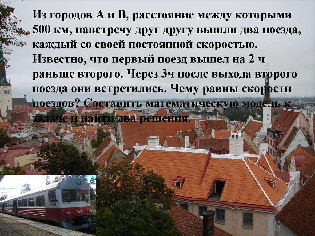 Из городов А и В, расстояние между которыми 500 км, навстречу другдругу вышли два поезда, каждый со своей постоянной скоростью.