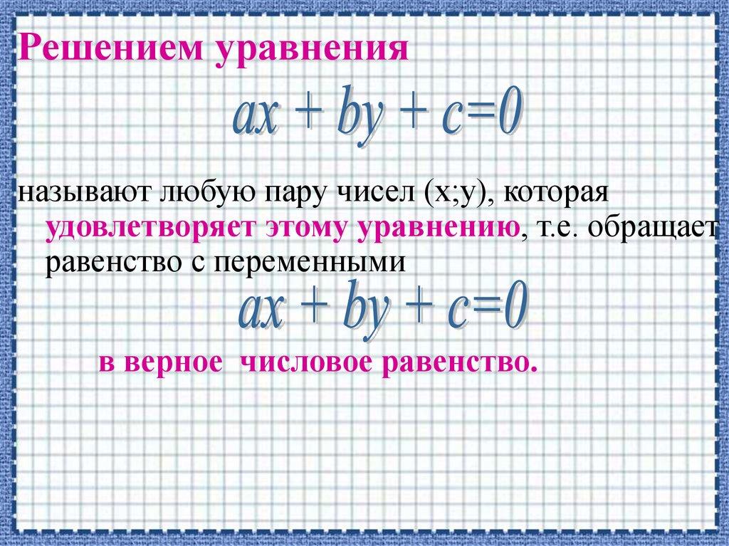 Решением уравненияназывают любую пару чисел (х;у), которая