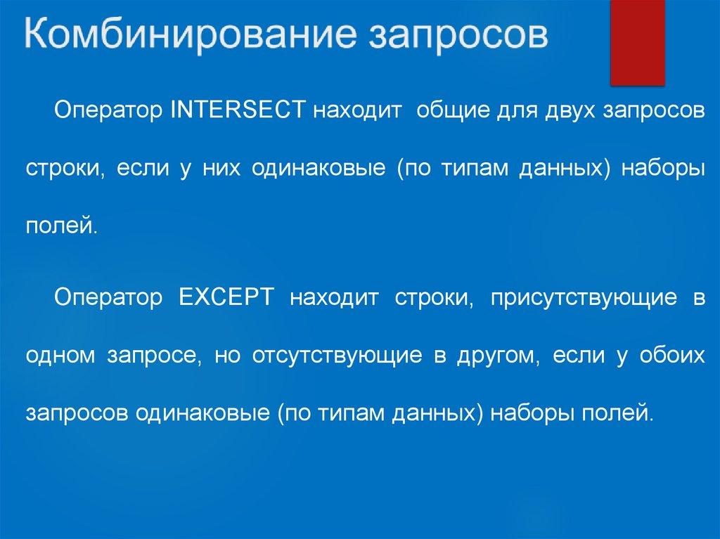 Оператор INTERSECT находит общие для двух запросовстроки, если у них одинаковые (по типам данных) наборы