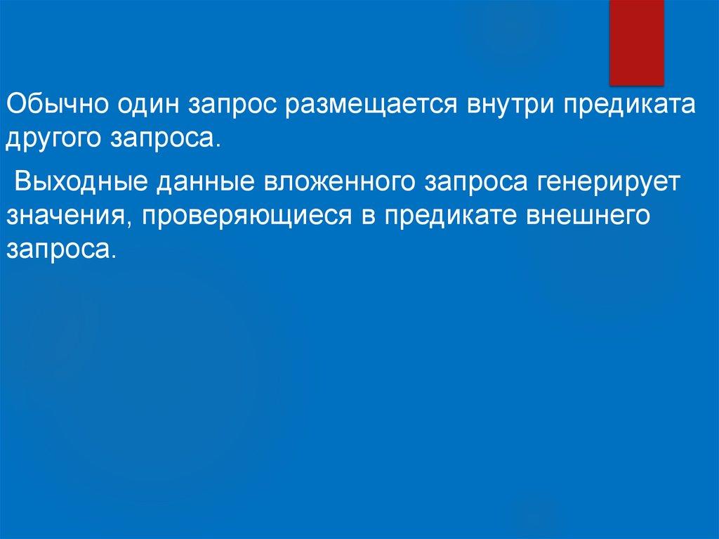 Обычно один запрос размещается внутри предикатадругого запроса.