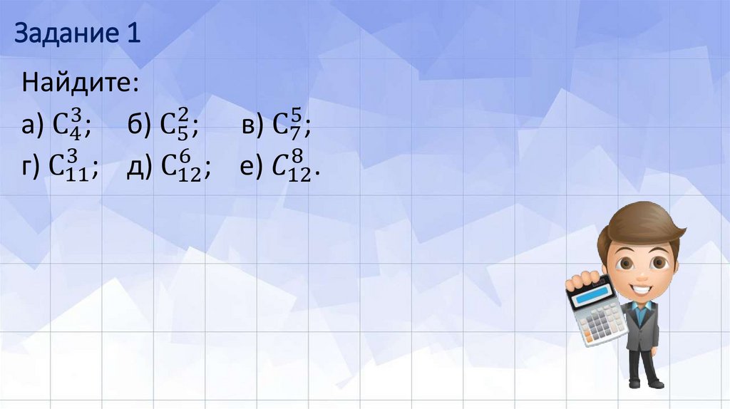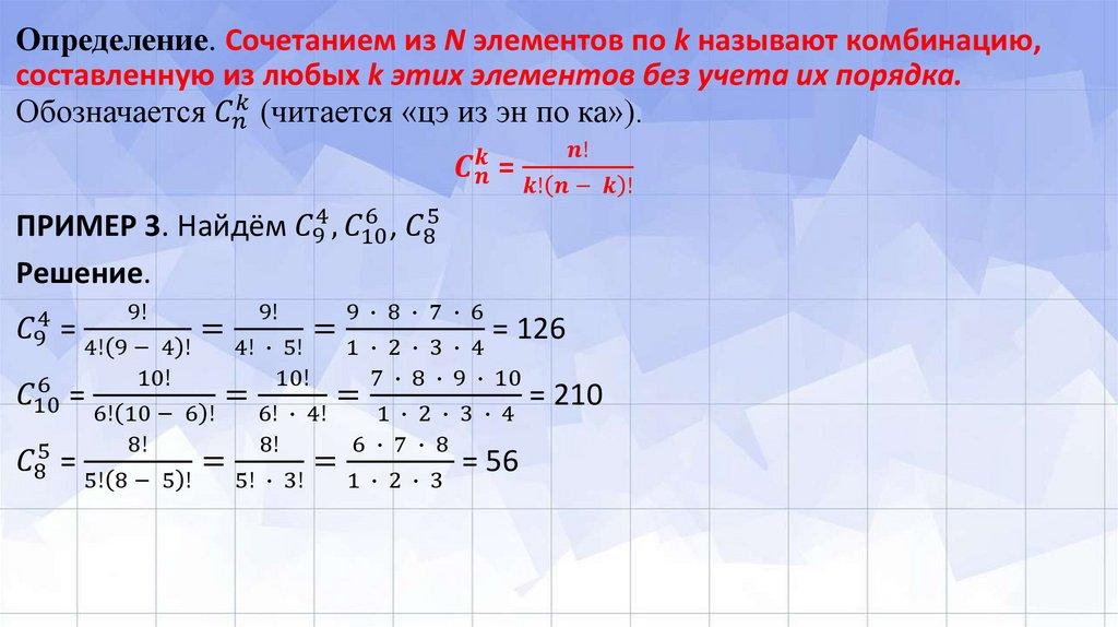 Определение. Сочетанием из N элементов по k называют комбинацию,составленную из любых k этих элементов без учета их порядка.