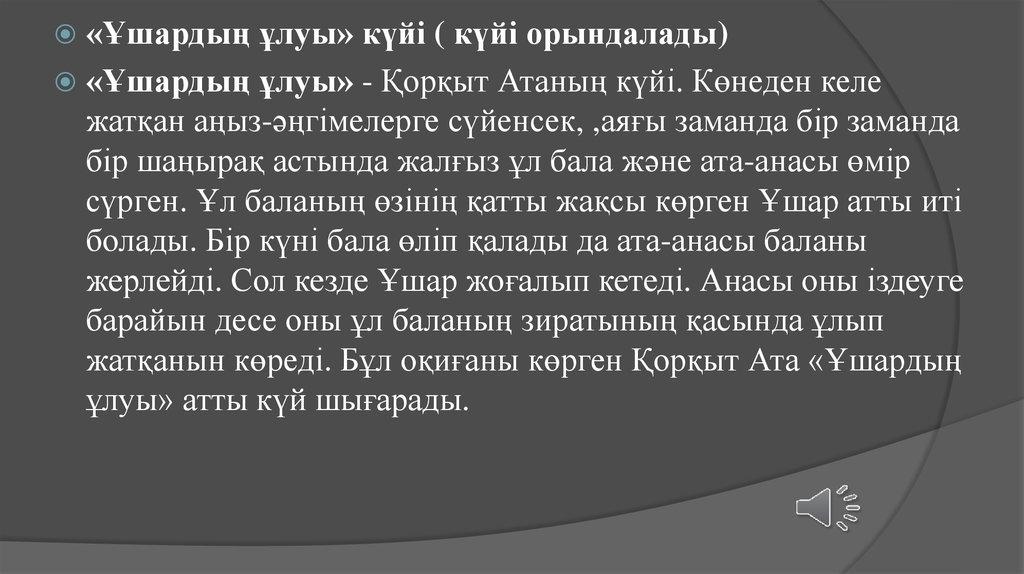 «Ұшардың ұлуы» күйі ( күйі орындалады)«Ұшардың ұлуы» - Қорқыт Атаның күйі. Көнеден келе