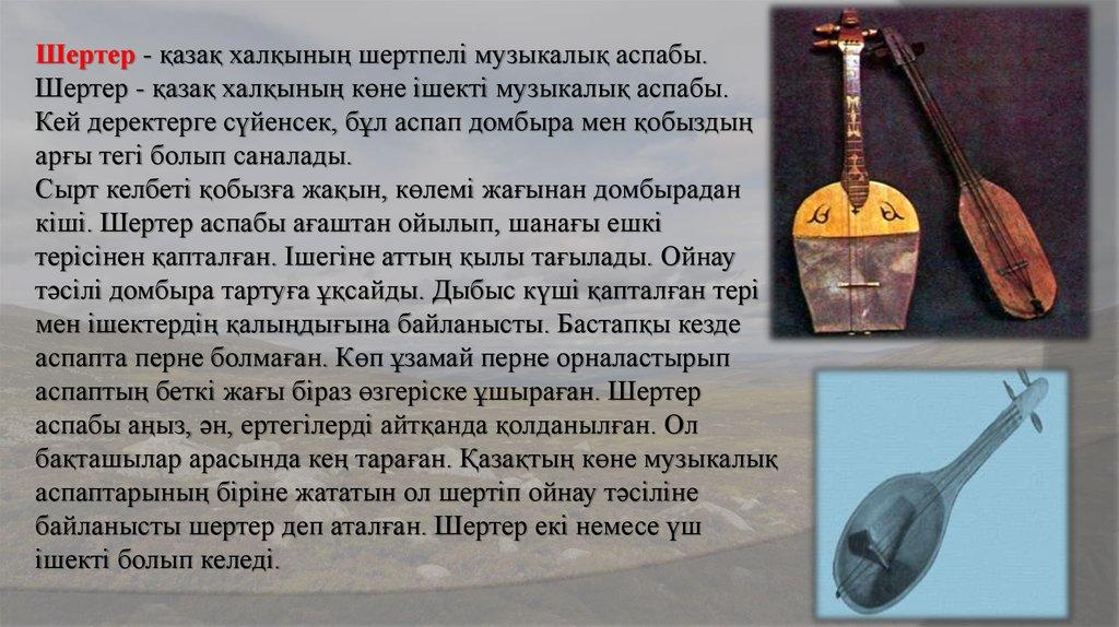 Шертер - қазақ халқының шертпелі музыкалық аспабы.Шертер - қазақ халқының көне ішекті музыкалық аспабы.